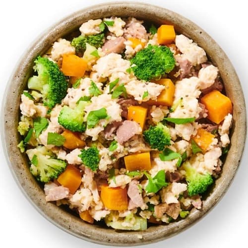 Kuřecí maso (50%), kuřecí žaludky (15%), kuskus (5%), brokolice, sladké brambory (10%), mrkev (5%), žampiony, koriandr, lososový olej, olivový olej, pivovarské kvasnice, chia a kurkuma