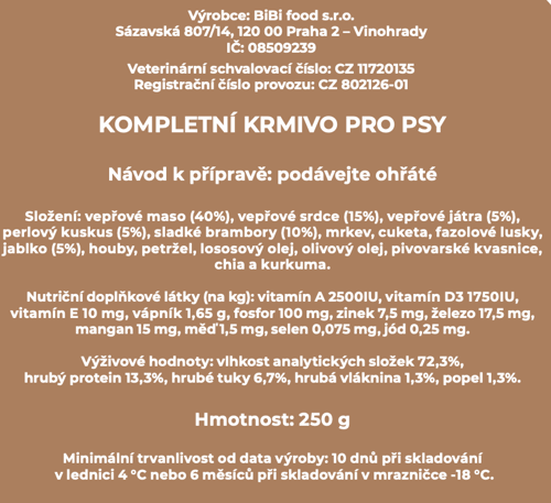 BiBi Food Vepřové hody – opravdové psí jídlo v páře. Nečekejte na zabijačku – s BiBi FOOD může být vepřový svátek každý den. V tomto menu se potkává šťavnaté vepřové maso, křehké srdce a játra s perlovým kuskusem, batáty, jablíčkem a celou partou zeleniny a bylinek. Výsledkem je voňavá dobrota, nad kterou bude pes ochotný i sedět, ležet a válet sudy.
