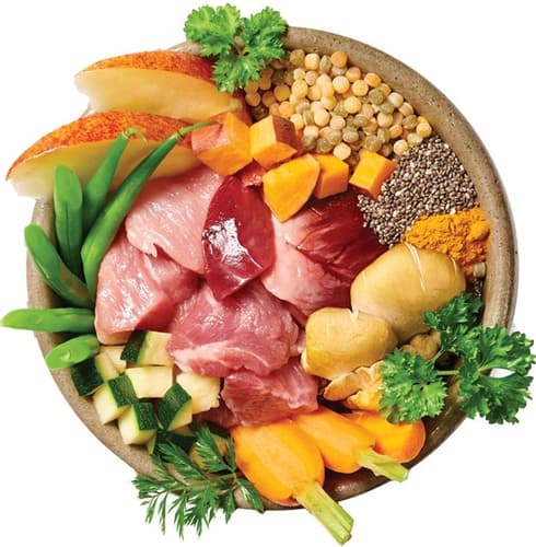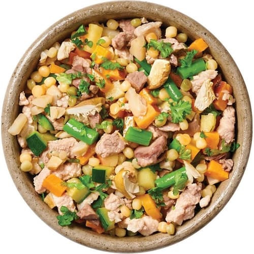 Vepřové maso (40%), vepřové srdce (15%), vepřová játra (5%), perlový kuskus (5%), sladké brambory (10%), mrkev, cuketa, fazolové lusky, jablko (5%), houby, petržel, lososový olej, olivový olej, pivovarské kvasnice, chia a kurkuma