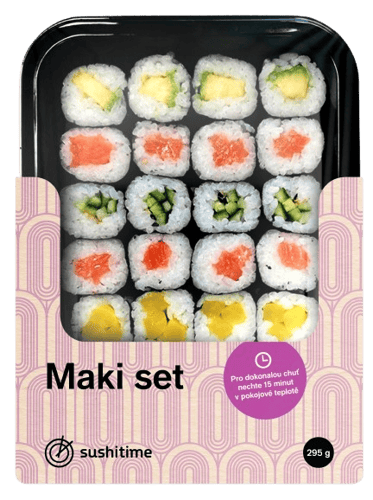 Sushi: rýže 72,2 % [vařená rýže (rýže, pitná voda), ocet rýžový (pitná voda, rýžový extrakt 8 %, ethanol, glukóza, kyselina: kyselina citronová; kvasničný extrakt)], syrový LOSOS 10,8 %, avokádo 5,4 %, okurka 5,4 %, nakládaná ředkev takuan 5,4 % (ředkev 90 %, pitná voda, jedlá sůl, regulátory kyselosti: kyselina octová, kyselina citronová; konzervanty: sorban draselný, DISIŘIČITAN sodný; sladidla: sacharin, acesulfam K, aspartam*; barvivo:
