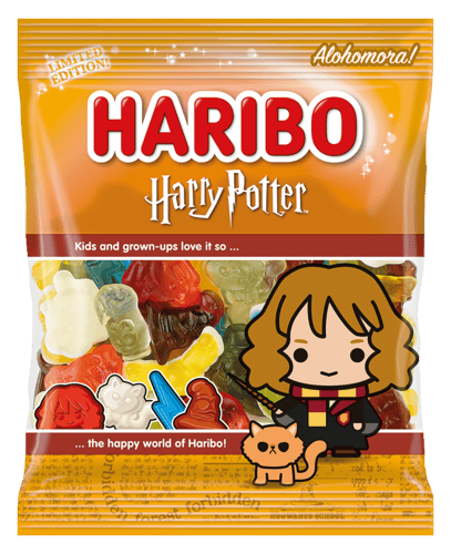 Haribo Harry Potter Hermione Granger jsou ovocné gumové bonbony s pěnovým cukrem. Každý sáček obsahuje ikonické tvary, jako je Zlatonka, Moudrý klobouk, Máslový ležák a další. V sáčku najdete příchutě jako cukrová vata, zelené jablko, cola a karamel.