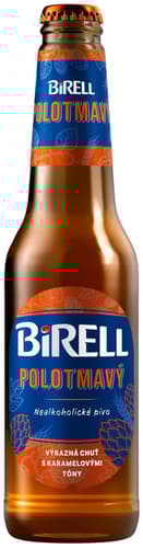 Birell polotmavý v sobě spojuje charakteristickou pivní hořkost Birellu světlého s karamelovými tóny pražených sladů typickými pro sladší tmavá piva. Bez konzervantů a umělých barviv