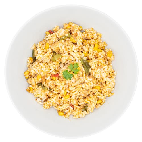 vařená rýže 38 %, kuřecí stehenní plátek 17,8 %, směs krájených paprik 17,8 % (červená, zelená a žlutá), loupaná krájená rajčata, kukuřice, cibule, slunečnicový olej, jedlá sůl, česnek, chilli, mletý černý pepř