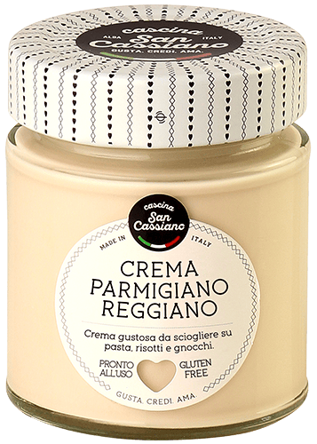 Cascina San Cassiano je jemná sýrová omáčka připravená z originálního sýra Parmigiano Reggiano s chráněným označením původu (D.O.P.). Vyznačuje se intenzivní chutí a krémovou konzistencí, která podtrhuje kvalitu použitých surovin.