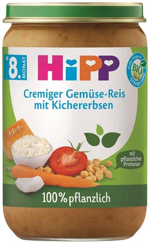 HiPP BIO zelenina s rýží, cizrnou a hráškovým proteinem je krémová zeleninová rýže vhodná od osmého měsíce. Obsahuje hodnotné proteiny z BIO hrášku, BIO cizrny nebo BIO čočky a neobsahuje přidanou sůl. Všechna HiPP menu obsahují vysoce kvalitní organický řepkový olej, který dodává přirozenou kyselinu alfa-linolenovou (omega 3 mastná kyselina).