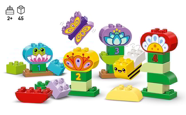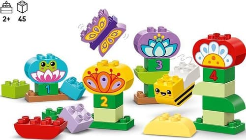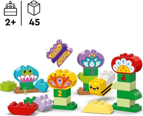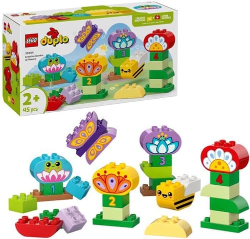 Pomozte své ratolesti rozvíjet kreativitu a jemné motorické dovednosti se stavebnicí LEGO® DUPLO® Město Kreativní zahrada a květiny. Tato stavebnice obsahuje 45 kostek na sestavení barevných květin, roztomilých zvířátek a hmyzu, a inspiruje kreativní děti k sestavení neustále se měnící krásy z kostek. Tato vzdělávací hračka podněcuje představivost malých dětí a umožní jim postavit si vlastní verzi světa, který každý den vidí kolem sebe. Děti ze 45 kostek poskládají zahradu a naučí se rozpoznávat čísla, procvičí rozpoznávání barev a začnou zdokonalovat svou řeč a jemné motorické schopnosti. Rozvinou také svou vytrvalost při skládání kostek na sebe, aby vytvořily zvířátka a květiny.