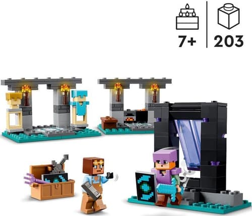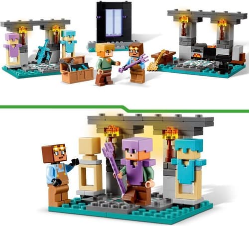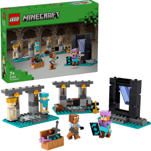 Milovníci hry Minecraft® od sedmi let si oblíbí akční stavebnici Zbrojnice. Představuje skvělý dárek pro děti a je ideálním úvodem do kreativního světa dobrodružných stavebnic LEGO® Minecraft. Součástí této stavebnice na motivy videohry Minecraft jsou dvě oblíbené postavy: akční hrdinka Alex se štítem a diamantovým mečem a pracovitý kovář brnění. Sada se skládá ze tří částí: z kovárny s kovadlinou, pecí, brusným kamenem a kotlíkem s lávou, ze zbrojnice s truhlou se zlatou sekerou, začarovaným trojzubcem, netheritovým mečem, štítem a dalšími prvky ze světa Minecraft a z portálu do Netheru s dveřmi, které malé stavitele dovedou k dalšímu dobrodružství.