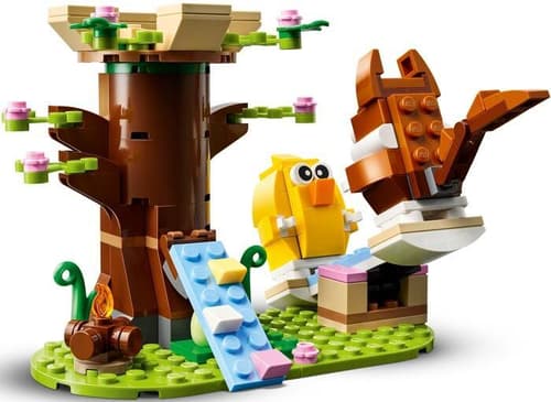 S LEGO® modelem Jarní hřiště pro zvířátka se děti od osmi let pustí do vyprávění zábavných příběhů s veverkou, ptáčkem, domečkem na stromě, ohništěm, houpačkou a dvěma velikonočními vajíčky. Hravé děti vylezou s veverkou a ptáčkem po rampě, posadí je na vrchol domečku na stromě, zavedou je k ohništi a pohoupají je na houpačce. Nechybí dvě velikonoční vajíčka a prostor pod rampou a za domečkem na zábavnou hru na schovávanou. Až si s ní děti dohrají, bude se skvěle vyjímat na poličce nebo na nočním stolku.
