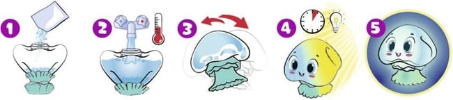 Vhodné pro děti od tří let. Medúzu naplňte Glibbi práškem, doleje vlažnou vodou a pořádně protřepe, vytvoří se tyrkysově zabarvený sliz, se kterým si lze hrát.