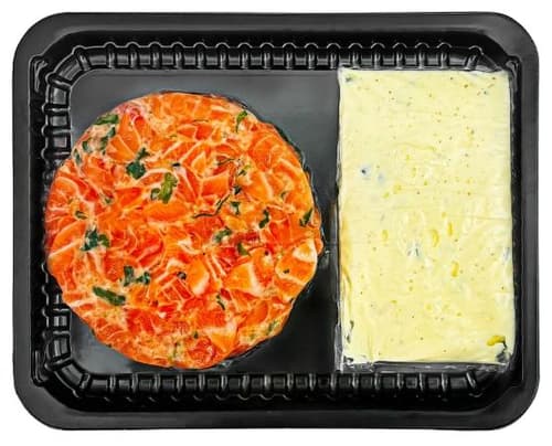 Losos obecný - Salmo salar (71 %), majonéza (voda, řepkový olej, bílý jogurt, ocet, cukr, modifikovaný kukuričný škrob, glukózo-fruktózový sirup, pasterizovaný vaječný žloutek, jedlá sůl, hořčice (voda, hořčičná semena, ocet, cukr, jedlá sůl, extrakt koření), modifikovaný bramborový škrob, regulátor kyselosti (kyselina citronová), zahušťovací přípravek (modifikovaný kukuřičný škrob, stabilizátor: xanthan, řepkový olej), stabilizátor (pektiny), konzervant (sorban draselný), antioxidant (kalcium-dinatrium EDTA).