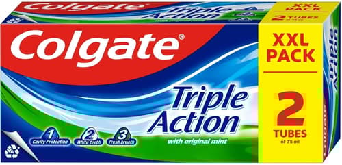 Colgate Triple Action Original Mint zubní pasta poskytuje kompletní péči o ústní dutinu díky trojímu účinku. Chrání zuby před zubním kazem, pomáhá zuby bělit a zajišťuje dlouhotrvající svěží dech. Fluoridová formule posiluje zubní sklovinu a zabraňuje zubnímu kazu, zatímco osvěžující příchuť Original Mint zanechává čistý a svěží pocit v ústech.