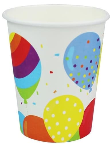 Jednorázové kelímky s nápisem Happy Birthday na party.