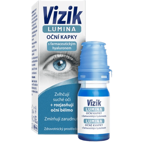 Zdravotnický prostředek. Oční kapky Vizik LUMINA s farmaceutickým hyaluronem poskytují intenzivní zvlhčení, péči a úlevu při příznacích syndromu suchého oka, jako jsou podráždění, zarudnutí, svědění, slzení nebo citlivost očí. Díky obsahu hyaluronátu sodného, který přirozeně váže vodu a vytváří ochranný film na rohovce, kapky zklidňují povrch oka bez ovlivnění vidění. Neobsahují konzervační látky, a jsou tak šetrné i při dlouhodobém používání. Vizik LUMINA je vhodný při nošení kontaktních čoček, vlivu klimatizace, prachu, větru, kouře, dlouhém sledování obrazovky, po očních zákrocích nebo při snížené tvorbě slz. Obsahují také patentní modř V, která zesvětluje a rozjasňuje oční bělmo tím, že redukuje mírné zarudnutí a nažloutlé zabarvení. Díky praktickému stlačovacímu dávkovači lze kapky používat až 12 měsíců po otevření. Balení obsahuje 10 ml.