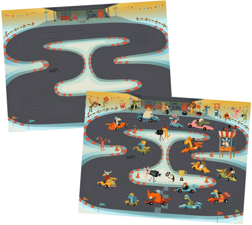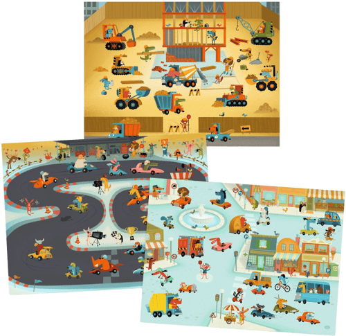 Oblíbené propisovací obrázky s tematikou aut a silnic. Závodní auta, stavební vozidla, dvoukolky nebo spousta náklaďáků ve městě, děti si vyberou pozadí a umístí na něj propisota. Snadná a zábavná činnost, která dětem umožňuje vymýšlet vlastní příběhy a vytvářet kompozice podle vlastní kreativity.