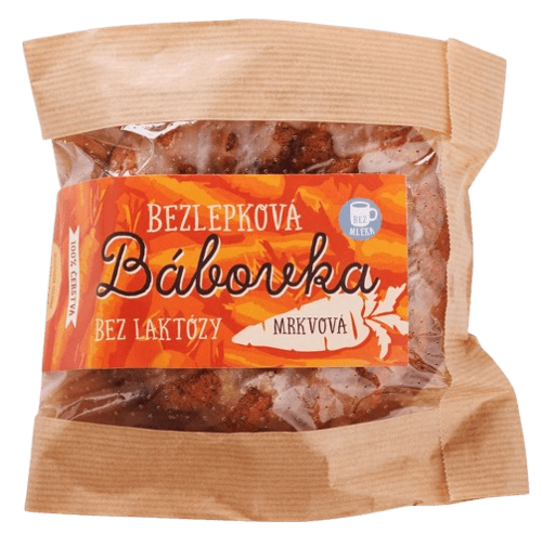 Bezlepková mrkvová bábovka značky Doktor Pekař. Je vláčná díky čerstvé mrkvi a jemně křupavá díky vlašským ořechům.