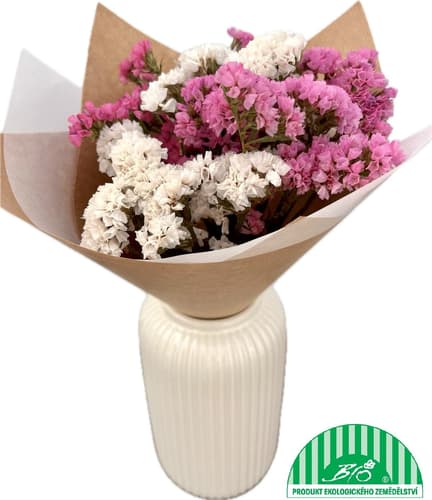 Kytice sušené statice "Happy Rose" v BIO kvalitě. Statice je tradiční květina, která dokáže dělat radost po celý rok. Má velice jemnou texturu a bohatý tvar, který dodává kytici lehkost a vzdušnost. Hodí se tak do všech typů interiérů. Eliška a Petr Richterovi se na statici specializují - najdete u nich tisíce rostlin a více jak deset různých kultivarů. Statice vydrží velmi dlouho ve váze, a jakmile ji vykvetou všechny kvítka, hodí se i k dekoracím či k sušení.