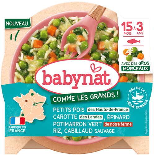 Receptura spojuje islandskou tresku s rýží a zeleninou z ekologického zemědělství, včetně hrášku, mrkve, špenátu a zelené dýně z vlastní farmy Babybio. Bez přidané soli, dochucovadel a konzervantů.