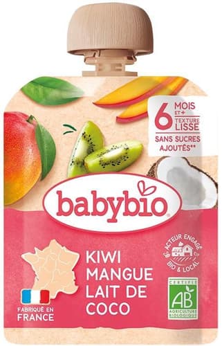 kiwi z Nouvelle-Aquitaine* 31 %, mango z Indie* 30 %, jablka z Francie* 29 %, kokosové mléko ze Srí Lanky* 10 % (kokos*, voda), bez přidaného cukru**, bez zahušťovadel, bez lepku a mléka