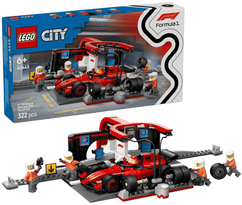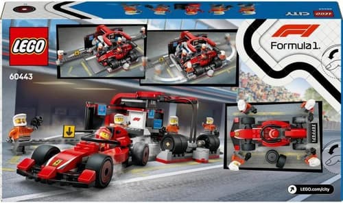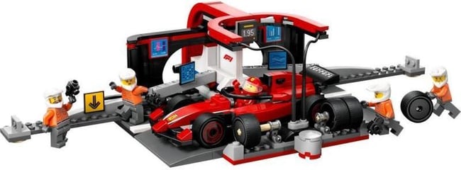 V této stavebnici děti najdou vše, co potřebují pro bleskurychlé zastávky v boxech, včetně nových hladkých pneumatik, utahováků na kola a personálu, který se po stisknutí spínače přesune do pozice pro ultrarychlou výměnu pneumatik. Stavebnice je přímo stvořená pro malé milovníky závodění a součástí je model závodního auta Formule 1 Ferrari a minifigurky řidiče a 4 členů personálu v boxech.