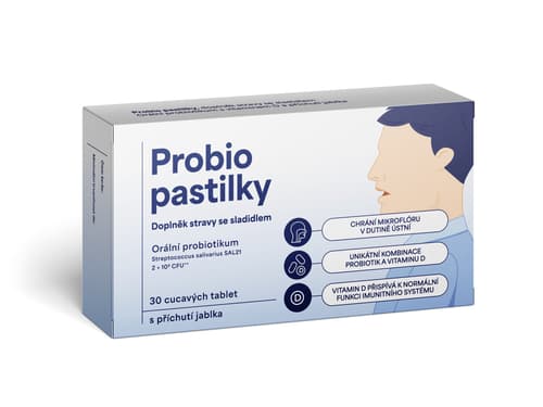 Doplněk stravy. Probio pastilky je orální probiotikum ve formě tablet rozpustných v ústech bez nutnosti zapíjet vodou. Pastilky obsahují navíc vitamin D, který přispívá ke správné funkci imunitního systému a udržení normálního stavu zubů. Vhodné pro dospělé a děti od 3 let. Pastilky obsahují sladidlo steviol glykosid a mají svěží příchuť zeleného jablka. Probio pastilky obsahují jedinečnou stabilizovanou kulturu Streptococcus salivarius SAL21 produkující peptidy, které pečují o přátelskou mikroflóru dutiny ústní. Bakterie druhu Streptococcus salivarius jsou přirozenou součástí ústní dutiny. Xylo-oligosacharidy jsou rozpustnou vlákninou, která má prebiotickou funkci. Benefity: Chrání mikroflóru v dutině ústní. Unikátní kombinace probiotik a vitaminu D. Vitamin D přispívá k normální funkci imunitního systému. Nepřekračujte doporučené denní dávkování. Uchovávejte mimo dosah dětí. Doplňky stravy nejsou náhradou pestré a vyvážené stravy. Balení obsahuje 30 cucavých tablet. Hmotnost obsahu 28 g.
