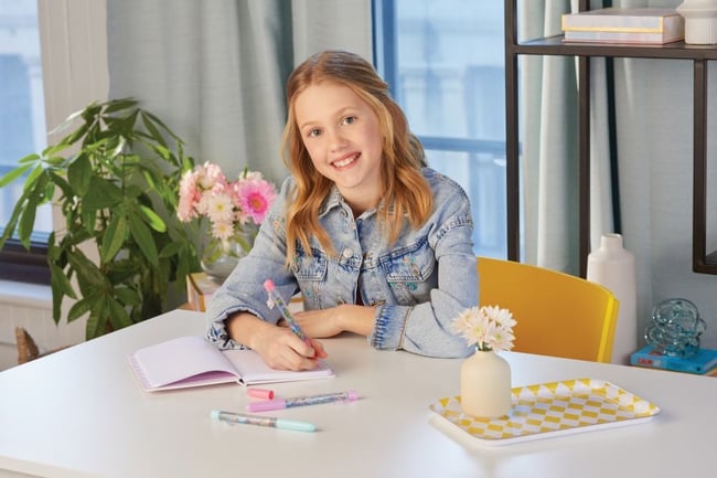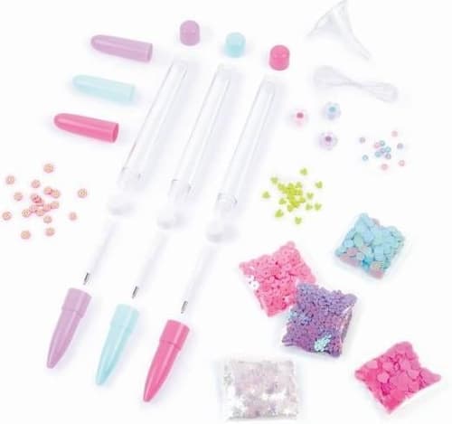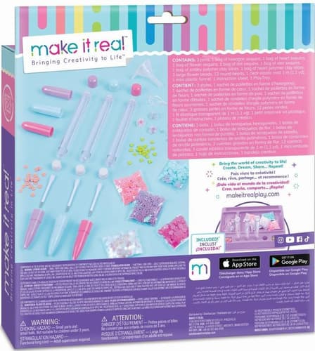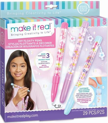 Díky sadě Make It Real si děti mohou vyrobit tři plovoucí pera a sledovat, jak se v nich vznáší kouzelné třpytky a ikony. Sada obsahuje trychtýř, tři těla per, uzávěry, třpytky a drobné doplňky – dost na to, aby naplnily každé pero více než jednou.