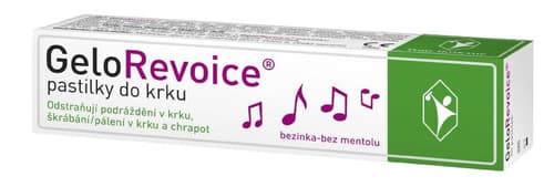 Zdravotnický prostředek GeloRevoice pastilky do krku s příchutí mentolu a bezového květu jsou zdravotnický prostředek, který chrání sliznici úst a krku. Používají se k odstranění příznaků, jako jsou chrapot, škrábání/pálení v krku a suchá sliznice, které způsobují bolest v krku nebo dráždivý, suchý kašel. Při cucání GeloRevoice pastilek do krku se uvolňuje speciální hydrogel komplex s kyselinou hyaluronovou. Hydrogel komplex dobře přilne na sliznici a vytváří na podrážděných místech ochranný film. Díky unikátnímu složení minerálů a mírnému pěnivému efektu stimulují pastilky (intenzivnější) tvorbu slin, což je velmi důležité pro zajištění konstantního působení hydrogelového komplexu v ústech a krku. Podrážděná sliznice se tak může regenerovat. Pastilky jsou vhodné i pro děti od 6 let a lze je užívat i v těhotenství a při kojení. Dále jsou vhodné pro diabetiky i vegany. Balení obsahuje 20 pastilek.