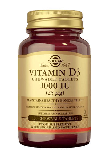 Doplněk stravy. Objevte sílu vitamínu D3 s doplňkem stravy Solgar žvýkacími tabletami. Každá tableta obsahuje 1000 IU vitamínu D3, který podporuje imunitní systém a zdraví kostí. Vychutnejte si lahodnou přírodní chuť jahod a banánu. Ideální pro dospělé a děti od 3 let. Hlavní výhody: 1000 IU vitaminu D3 v jedné tabletě. Chutný a snadný způsob, jak podpořit imunitní systém a zdraví kostí. Vhodné pro vegetariány. Bez obsahu umělých barviv a konzervantů. Vitamín D přispívá k normálnímu vstřebávání/využití vápníku, fosforu a správné hladině vápníku v krvi, napomáhá udržení normálního stavu kostí, zubů a správné činnosti svalů. Vitamín D se také podílí na procesu dělení buněk. Nepřekračujte doporučené denní dávkování. Uchovávejte mimo dosah dětí. Doplňky stravy nejsou náhradou pestré a vyvážené stravy. Balení obsahuje 100 žvýkacích tablet. Hmotnost obsahu: 40 g.