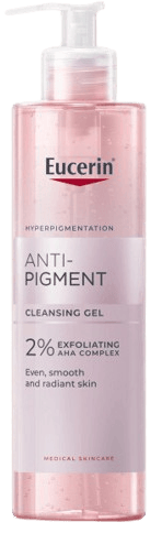 Eucerin Anti-Pigment rozjasňující čisticí gel s 2% AHA komplexem (kyselina mléčná a glykolová) jemně exfoliuje a okamžitě rozjasňuje pleť. Účinně odstraňuje odumřelé buňky, hydratuje a zjemňuje pokožku díky glyceryl glukosidu. Pomáhá redukovat pigmentové skvrny a je ideální pro každodenní použití na všechny typy pleti. Objemné 400ml balení.
