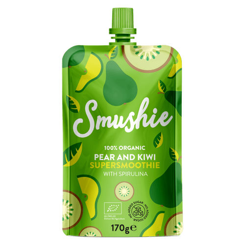 Ovocná kapsička Smushie BIO Fresh Boost spojuje 100% přírodní ingredience v BIO kvalitě. Bohatá chuť sladkého pyré z hrušek, kiwi a banánu je doplněná snítky máty, ovesnými vločkami a superpotravinovým boostem v podobě spiruliny. Kapsička je navíc bez přidaných cukrů – obsahuje pouze přirozeně se vyskytující cukry. Neobsahuje barviva, aromata ani konzervanty.