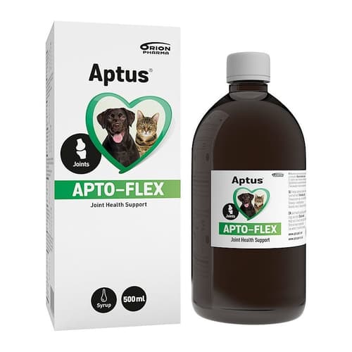 Aptus Apto-Flex je veterinární nutriční doplněk ve formě sirupu určený pro psy a kočky. Zajišťuje výživu a regeneraci chrupavek a vazů v kloubech. Obsahuje kyselinu hyaluronovou, která udržuje měkkost, pružnost a vazkost chrupavek. Kolagen je zdrojem ochranných, stavebních a výživných aminokyselin kloubních chrupavek. Chondroitin je základní strukturální složkou kloubní chrupavky a glukosamin sulfát je zejména součástí kloubních vazů. Velikost balení je 500 ml.