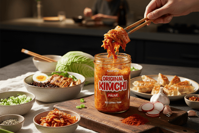 Kimchi Sarwu je tradiční korejská fermentovaná zelenina vyráběná ručně v České republice. Kombinace zelí, rybí omáčky, krevet a hrušky vytváří jedinečný chuťový zážitek, který si zamilujete. V chuti je pikantní.