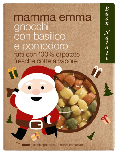 Speciální vánoční edice gnocchi Mamma Emma se Santou. Balení obsahuje 3 druhy gnocchi – bramborové, s bazalkou a s rajčaty. Vysoký podíl brambor zaručuje spolu se speciální moukou skvělý chuťový zážitek. Master používá pro výrobu svých noků pouze vlastní mouku.