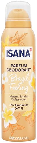 ISANA deodorant pro ženy Brazil Feeling má květinově-svěží vůni frangipani a jasmínu, doplněnou jemným nádechem vanilky. Účinná a dlouhotrvající ochrana proti tělesnému pachu. Složení nezanechává bílé stopy. Bez hliníku (ACH).