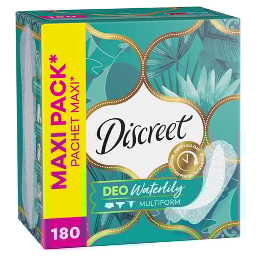 Intimní vložky Discreet Multiform Waterlily vám pomohou cítit se svěží a krásná bez ohledu na váš styl. Umožňují pokožce v intimních partiích přirozeně dýchat, a zajišťují tak až 12 hodin svěžesti a pohodlí. Jsou tak tenké, že je ani neucítíte. Navíc se díky svému flexibilnímu provedení přizpůsobí každému střihu spodních kalhotek. Charakteristická vůně leknínu je velmi svěží a ženská.