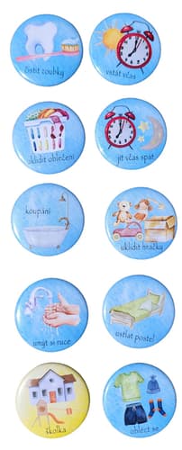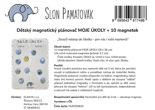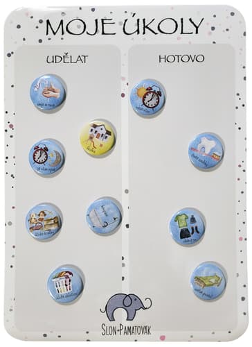 Obsah balení: magnetický plánovač Moje Úkoly (26 × 36 cm), deset ručně malovaných magnetek (průměr 3,7 cm) s názvy: čistit zoubky, koupání, obléct se, umýt si ruce, ustlat postel, uklidit oblečení, uklidit hráčky, vstát včas, jít včas spát, školka.