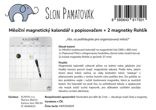 Slon Pamatovák Měsíční magnetický kalendář s popisovačem a Rohlík magnetky