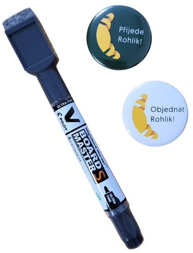 Obsah balení: nedatovaný kalendář na magnetické folii (36 × 46 cm), magnetka Přijede Rohlík!, magnetka Objednat Rohlík!, popisovač Pilot V-Board Master S Ultra Fine s integrovanou houbičkou (černý nebo modrý – dle dostupnosti, šíře stopy 0,8 mm, s možností výměny náplně).