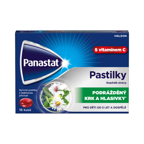 Doplněk stravy. Panastat ve formě pastilek s přírodním složením pečuje o zdraví dýchacích cest a zklidňuje podrážděné hrdlo a hlasivky. Obsahuje kombinaci bylin – heřmánek pravý, mátu peprnou, proskurník lékařský, šalvěj lékařskou a mateřídoušku obecnou – které podporují správnou funkci dýchacího systému. Obsažený vitamín C přispívá k normální funkci imunitního systému a pomáhá chránit buňky před oxidativním stresem. Pastilky jsou vhodné pro dospělé a děti od 5 let a mají lahodnou malinovou chuť. Nepřekračujte doporučené denní dávkování. Uchovávejte mimo dosah dětí. Doplňky stravy nejsou náhradou pestré a vyvážené stravy. Balení obsahuje 16 ks. Hmotnost obsahu: 56 g.