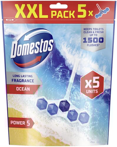 Domestos Power 5 Ocean perfektně ochrání vaši toaletu před vodním kamenem. Toaletní mísa bude čistá s viditelným leskem. Při každém spláchnutí vytvoří WC blok Domestos Power 5 Ocean bohatou pěnu s příjemnou vůní.