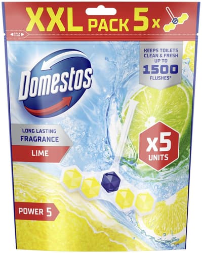 Tuhý WC blok Domestos Power 5 poskytuje vaší toaletě komplexní péči. Blok zabraňuje tvorbě vodního kamene, vytváří bohatou svěží pěnu, zaručuje čistý povrch toaletní mísy s viditelným leskem a v neposlední řadě zanechává hygienickou čistotu a dlouhotrvající svěží vůni při každém spláchnutí.