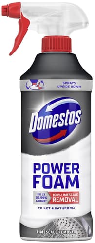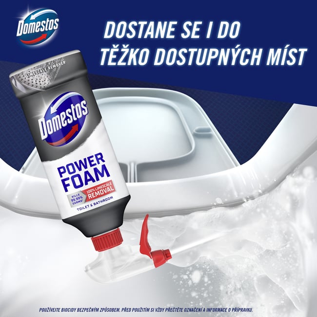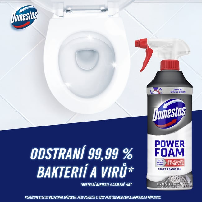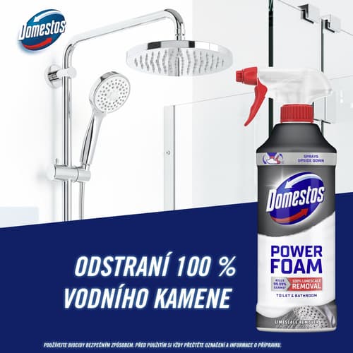 Pěna ve spreji Domestos Power Foam žádný vodní kámen poskytuje 100% odstranění vodního kamene v nové revoluční formě. Speciálně vyvinutý rozprašovač zbaví vaši toaletu také 99,99 % bakterií a virů i na těžko dostupných místech. Domestos Power Foam žádný vodní kámen můžete otočit vzhůru nohama a pěnu tak nastříkat i tam, kam to s běžným balením nebylo možné.
