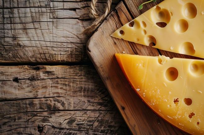 Plátky polotvrdého sýru Maasdam s typickými velkými oky. Má nasládlou chuť s jemně pikantními a oříškovými tóny.