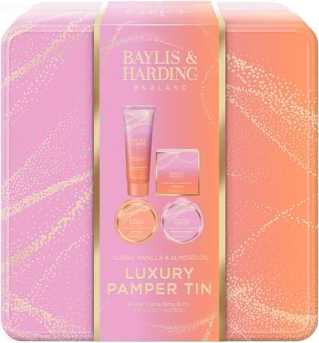 Baylis & Harding Dárková sada péče o tělo v plechové dóze – jojoba, vanilka a mandlový olej je elegantní kolekce čtyř produktů, která promění každodenní péči o pokožku v hýčkání smyslů.