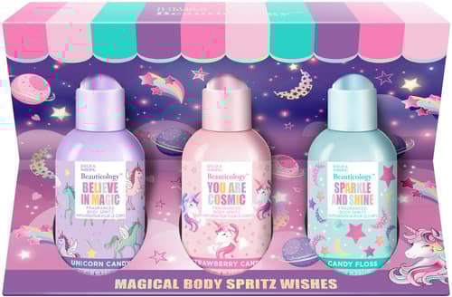 Dárková sada tělových sprejů Unicorn přináší sladký voňavý zážitek v podobě tří tělových mlh (3 × 100 ml). Hravé vůně cukrovinek, jahodových bonbonů a cukrové vaty potěší všechny milovníky fantazie a rozzáří každý den. Díky lehké konzistenci osvěží kdykoliv během dne, aniž by zanechaly na pokožce lepivý pocit. Barevně sladěné balení s motivem jednorožce z nich dělá kouzelný dárek i stylový doplněk do koupelny. Produkty jsou navíc vegan & cruelty free.
