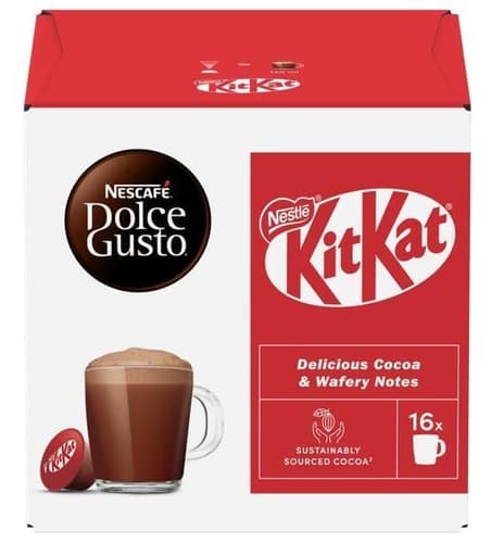 Horký kakaový nápoj s příchutí KitKat od Nescafé® Dolce Gusto. V nápoji dominují oplatkové a karamelové tóny.