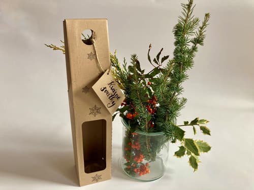 Součástí je i stylová jmenovka s nápisem „Krásné svátky“, která dodá dárku osobní dotek a vyvolá radost už při předávání. Krabička je dostatečně pevná, aby chránila láhev, a přitom působí lehce a přirozeně – ideální volba pro ty, kteří si potrpí na estetické i ekologické dárkové balení.
