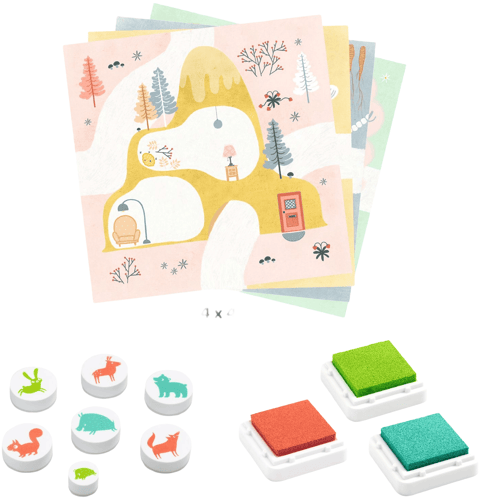 Razítkovací set Strom zvířátek přináší dětem radost z tvoření i kouzlo fantazie. Pomocí 7 pevných razítek a 3 barevných polštářků si mohou dotvořit veselé kartičky plné zvířátek a jejich cestiček. Stačí vybrat kartičku, otisknout razítka a sledovat, jak se obrázek krok za krokem proměňuje v živou scénu. Razítka jsou snadno uchopitelná i pro malé ruce a díky barevnému označení děti hned poznají, který polštářek použít. Ultra omyvatelný inkoust navíc zaručí tvoření bez obav z ušpinění.