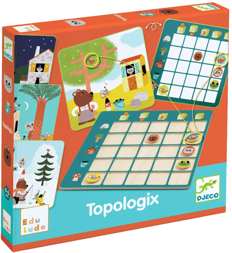 Eduludo Topologix je chytrá vzdělávací hra, která děti učí orientovat se v prostoru zábavnou a názornou formou. Úkolem je umístit dřevěné figurky zvířátek na herní desku přesně podle zadání na kartičce – třeba „kočka je pod stromem, ryba je v rybníku“. Po dokončení úkolu děti otočí kartu a samy si ověří, zda řešení zvládly správně. Hra tak rozvíjí nejen prostorové vnímání a logické uvažování, ale také trpělivost, soustředění a schopnost samostatné kontroly.