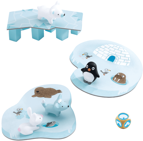 Každý hráč hází kostkou a posouvá zvířátka po ledovém mostě. Pokud všichni společně pomohou čtyřem kamarádům do iglú dříve, než most spadne, vítězí celý tým.