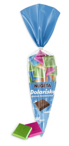 Kousky ledové čokolády značky Nugeta. Ledová čokoláda je připravována smíšením mléčné čokolády a kokosového oleje.